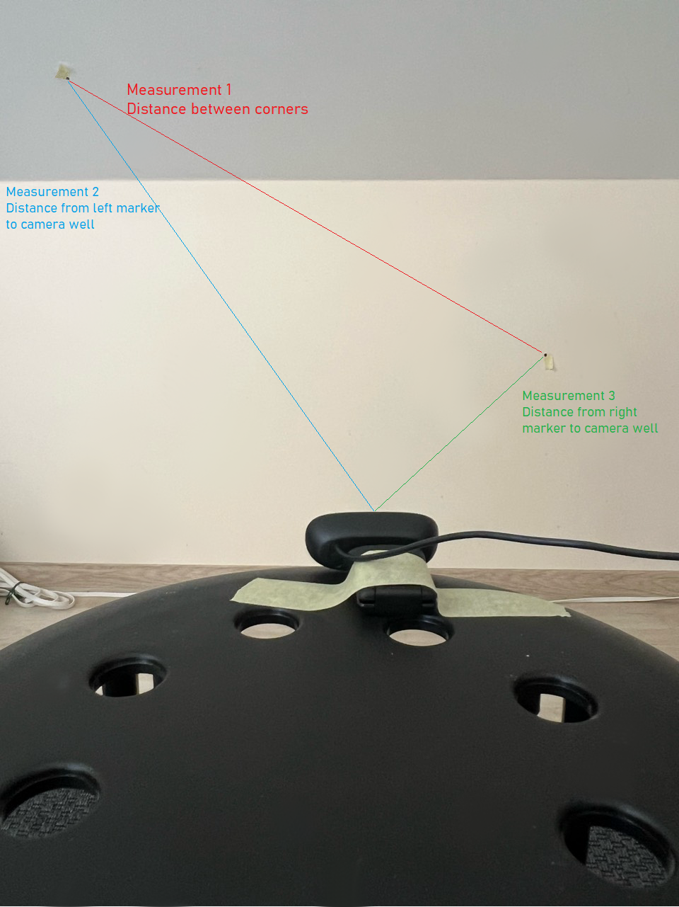 This type of calibration requires us to measure distance between two opposite points in camera view as well as distance from camera lens to those two points - giving us three measurements that we need to input into application. We want to be as precise with the measurements as we possibly can.
