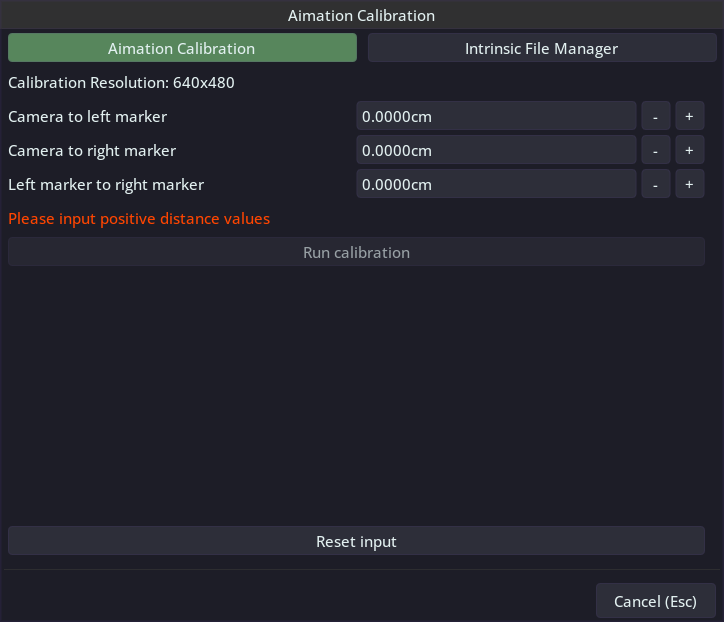 Input measurements into appropiate fields and select "Run calibration". When it is done successfully you will have an option to name calibration file, we recommend giving it unique name to be able to identify it later if you plan on using more than one device.