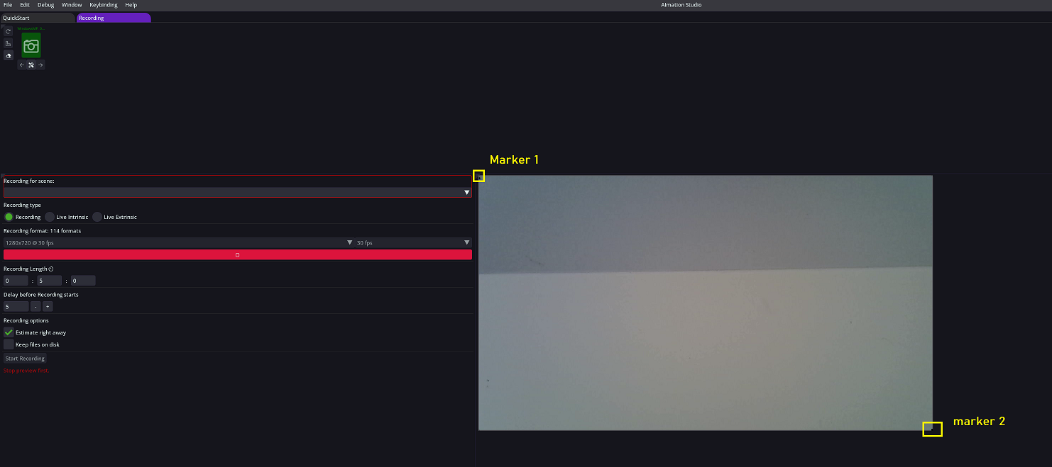 While looking at preview, place first marker on the wall so it is in the top left corner of camera view. We want to be as precise as possible here, ideally the edge of the marker should be exactly at the edge of the view so it's not even visible in the preview.