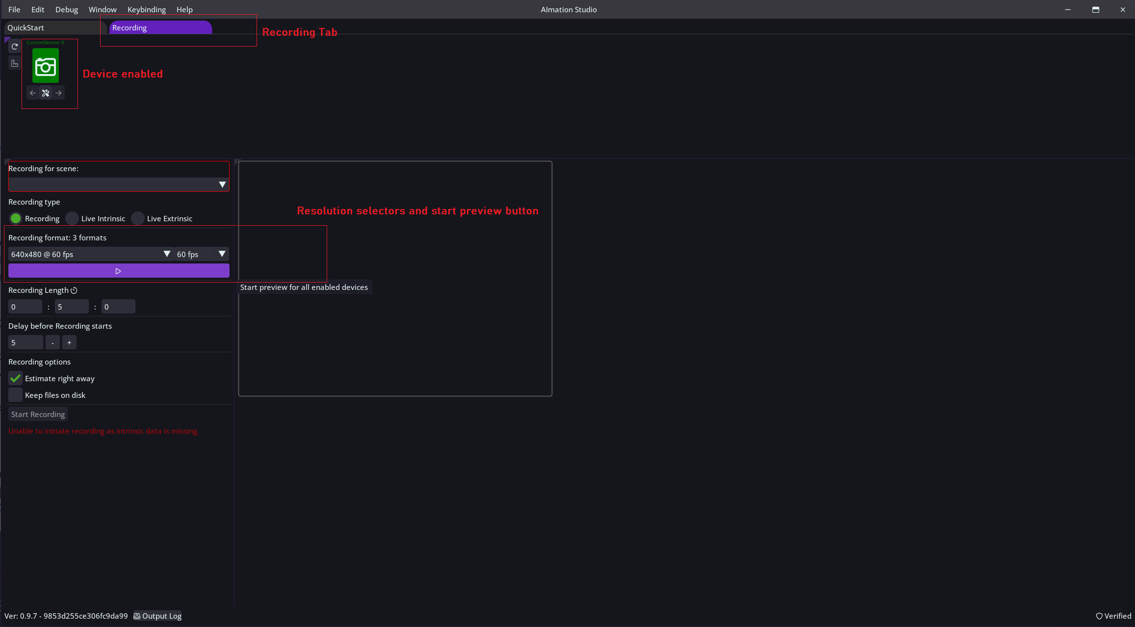 Enable the device you want to calibrate by clicking on the camera icon, select recording format (resolution) that you want to calibrate for and start preview of a device ( Play button below resolution selector ).