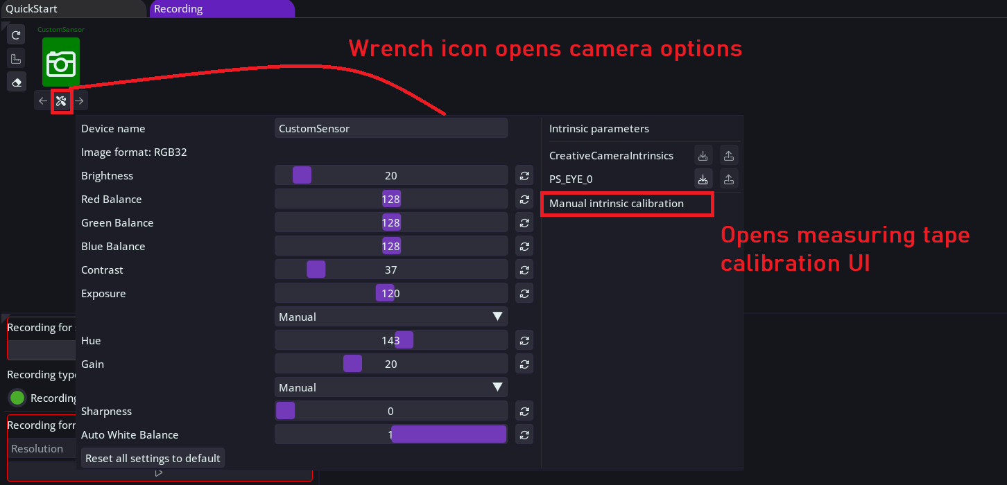 Open camera options via the wrench button under the camera that is currently running and select 'Manual intrinsic calibration', this will open calibration UI.