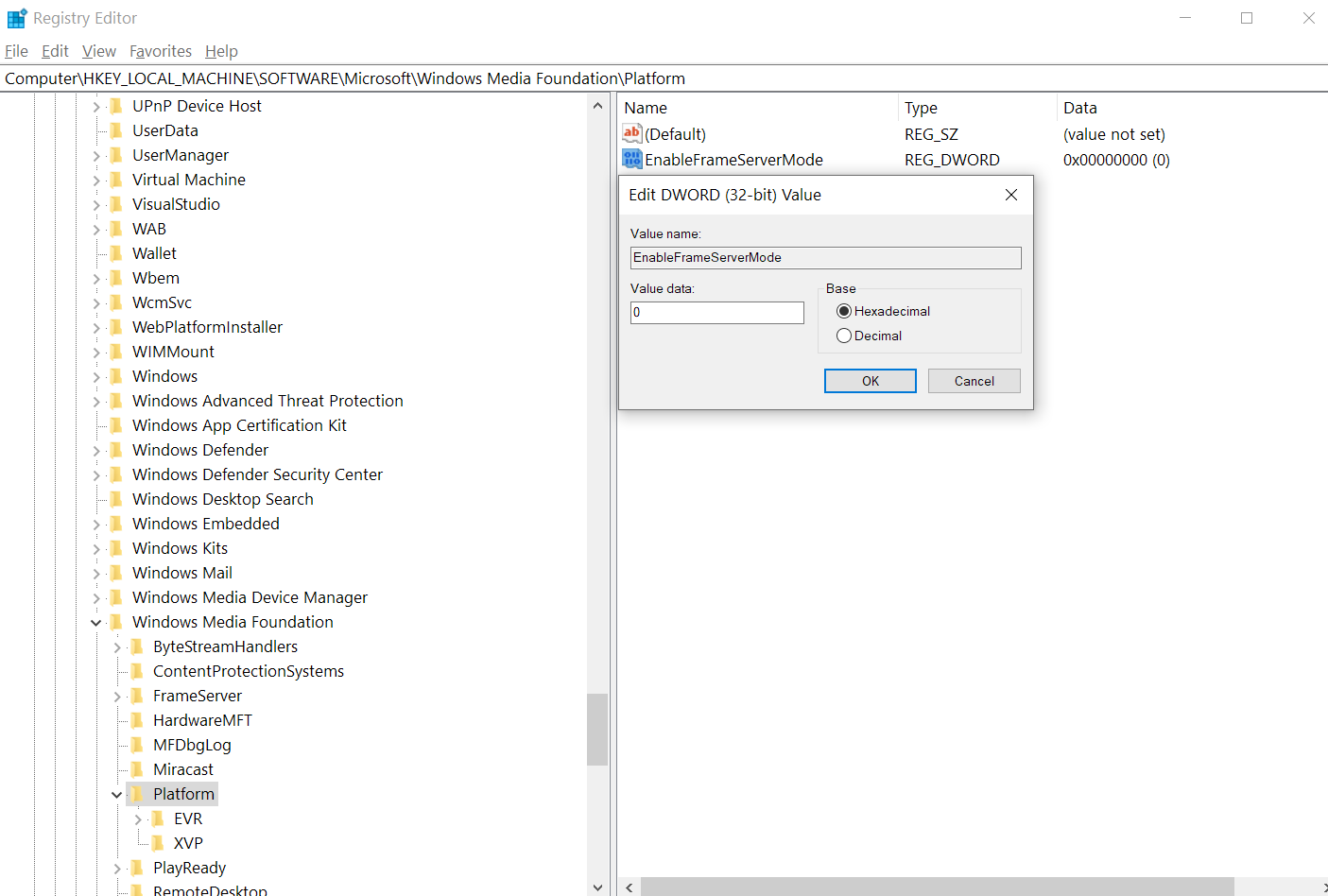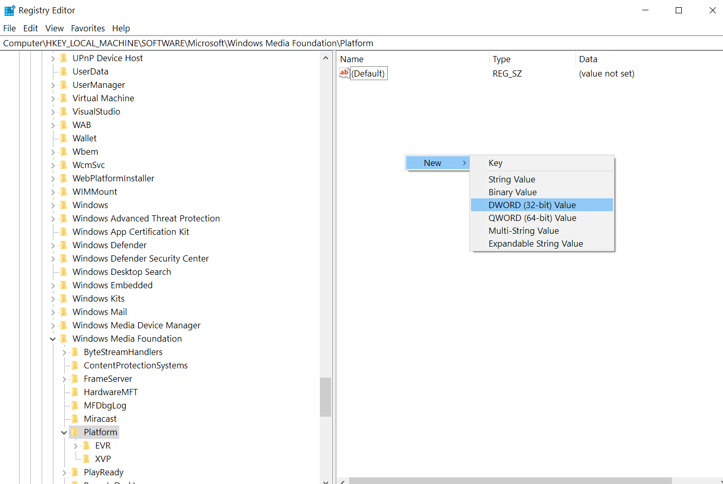 Full registry key path is: Computer\HKEY_LOCAL_MACHINE\SOFTWARE\Microsoft\Windows Media Foundation\Platform